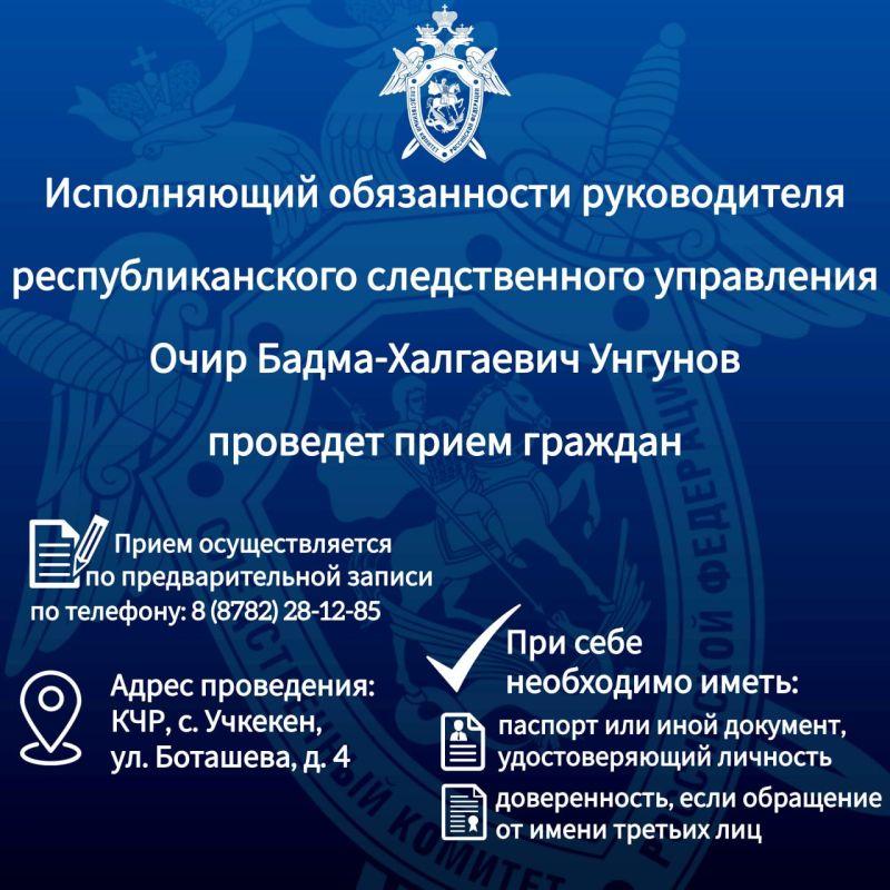 26 сентября 2025 года и.о. руководителя следственного управления Следственного комитета Российской Федерации по Карачаево-Черкесской Республике полковник юстиции Унгунов Очир Бадма-Халгаевич проведет личный прием граждан в следственном отделе по...