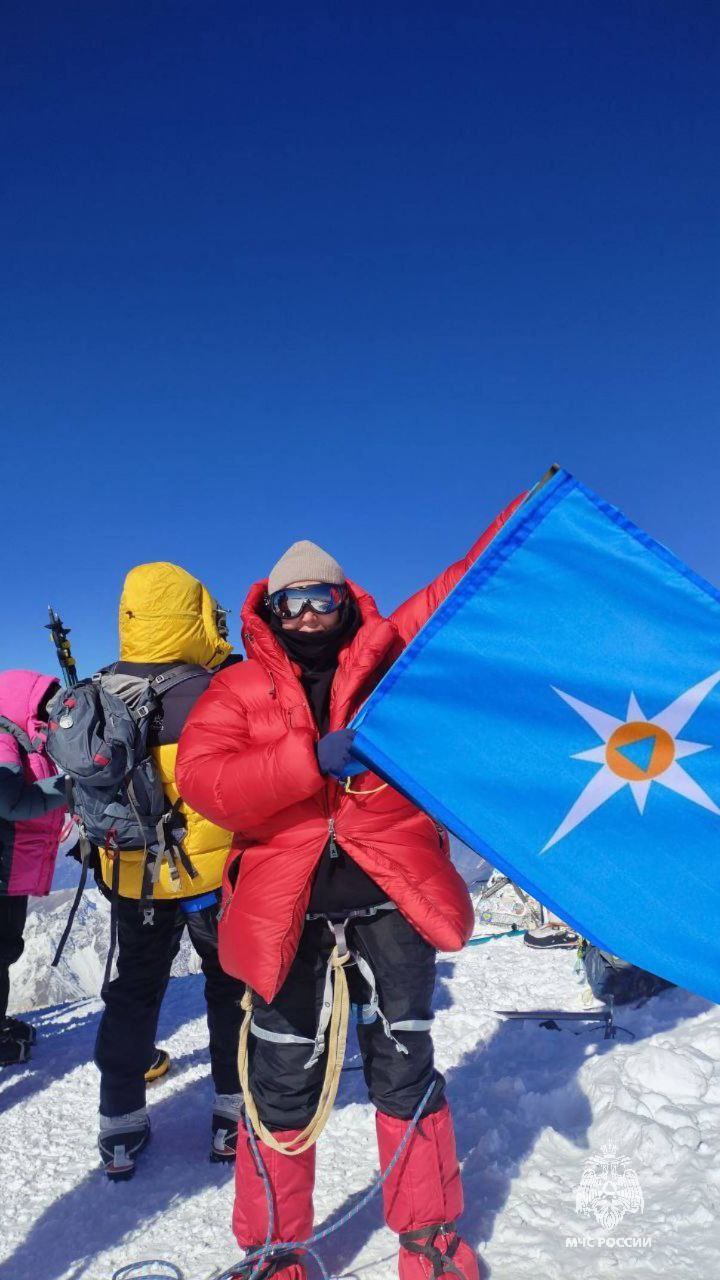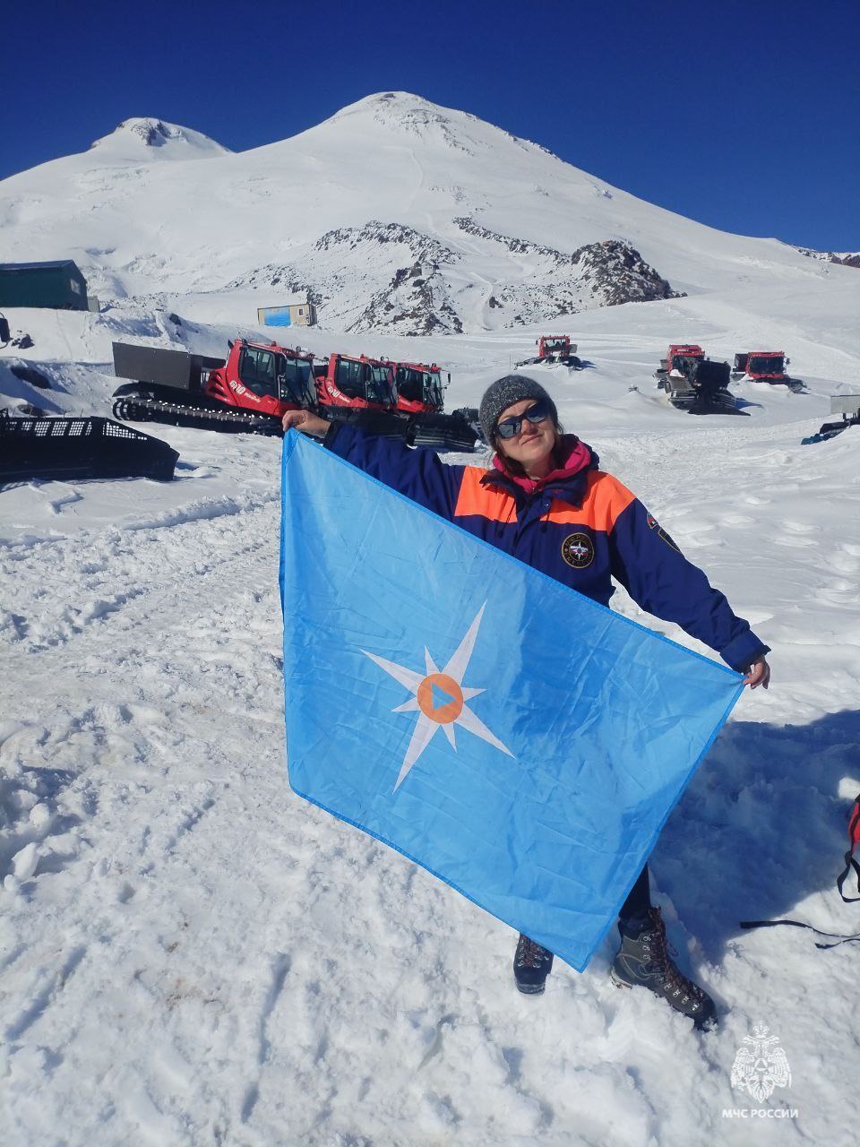 В рамках 35-летия МЧС России главный специалист-эксперт юридического отделения Главного управления МЧС России по КЧР Дженетхан Кубекова поднялась на западную вершину Эльбруса и развернула флаг чрезвычайного ведомства на 5 642 метрах над уровнем моря.