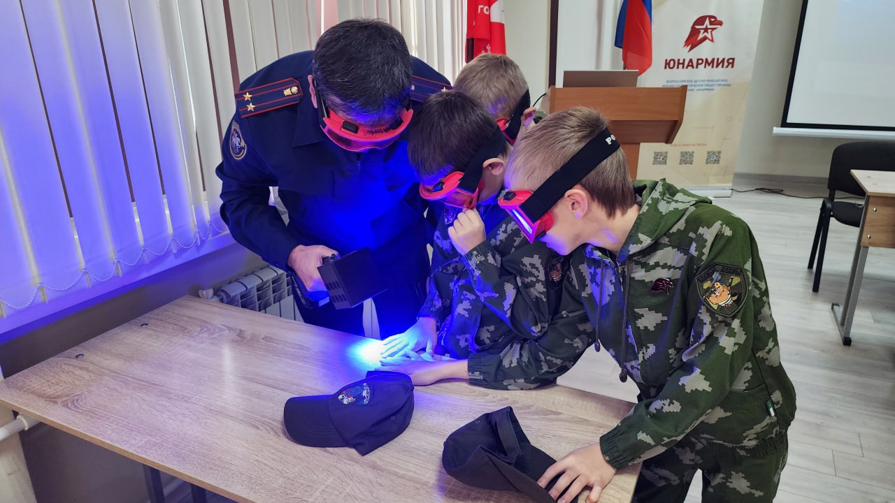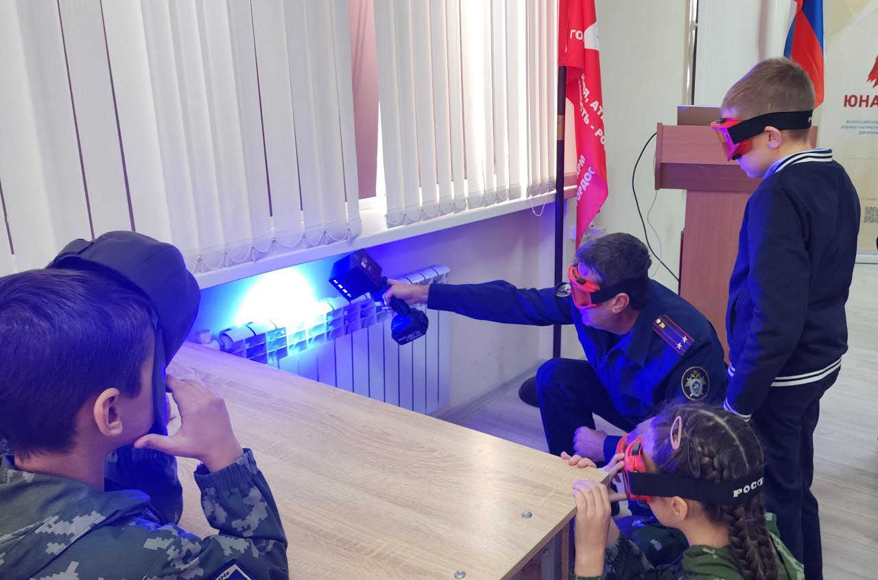 В завершение встречи следователь-криминалист Марат Умарович Хаджимусов продемонстрировал юнармейцам криминалистическую технику, имеющуюся в арсенале следственного управления. Ребята смогли попробовать себя в роли следователей и отыскать следы воображаемого преступления. Они с живым интересом участвовали в поиске «улик», задавая вопросы криминалисту, который подробно рассказал о способах использования каждого технического средства.