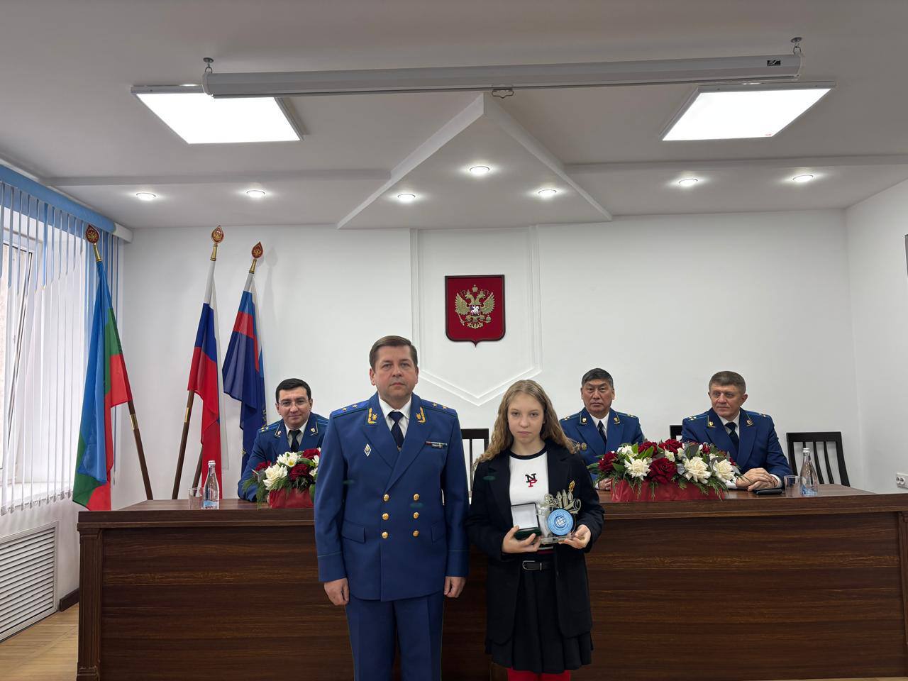 Вручены дипломы и ценные подарки детям работников прокуратуры за участие в творческих конкурсах, организованных Генеральной прокуратурой Российской Федерации: Альбине Погорельской, занявшей III место в Международном молодежном конкурсе социальной антикоррупционной рекламы «Вместе против коррупции» в номинации «Лучший видеоролик» по результатам голосования национальной конкурсной комиссии Российской Федерации; Эльдару Шаову и Дарине Дзыба за участие в творческом конкурсе «Прокуроры на страже детства».