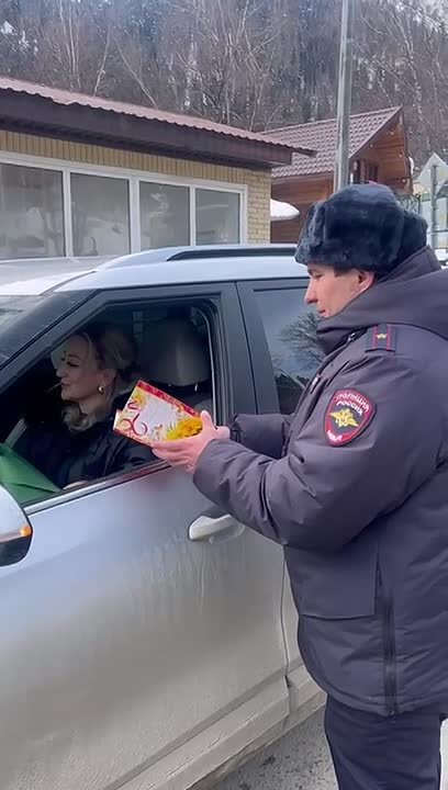 Дорожные полицейские останавливали автомобили, управляемые женщинами, чтобы лично поздравить их с праздником и вручить весенние цветы.