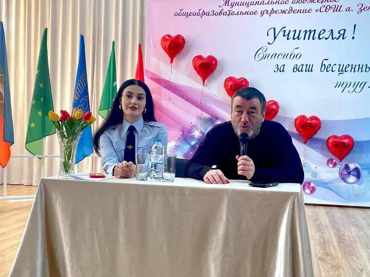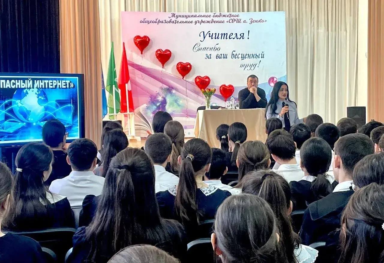 Старший оперуполномоченный по особо важным делам Центра по противодействию экстремизму МВД по КЧР Ирина Пхешхова и заместитель председателя ОС при МВД по КЧР Алий Байрамкулов провели в Хабезском районе встречу с учениками средних и старших классов средней школы а. Зеюко.