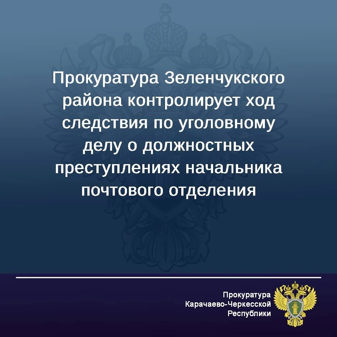 Прокуратура Зеленчукского района признала законным решение о возбуждении уголовного дела в отношении начальника районного отделения почтовой связи по ч. 3 ст. 160 УК РФ (присвоение с использованием своего служебного положения, в крупном размере), ч. 1 ст. 292 УК РФ (служебный подлог).