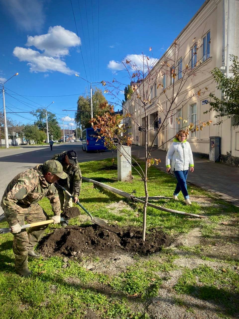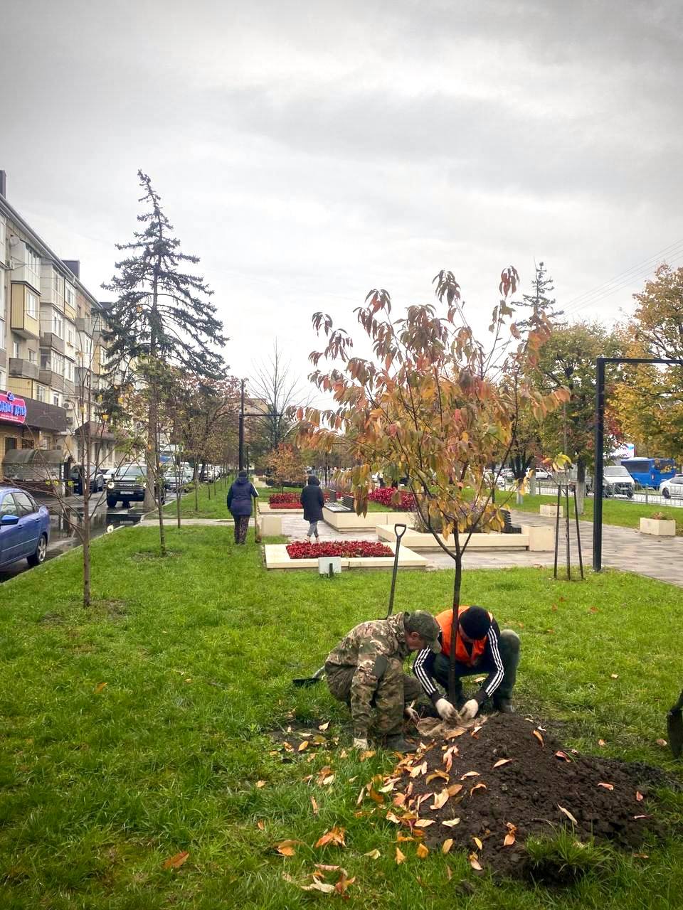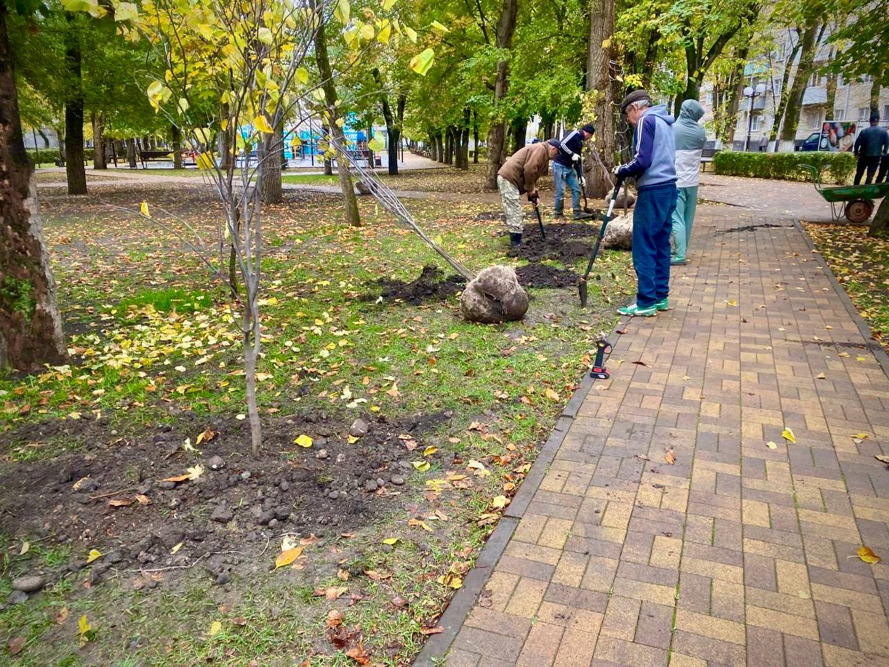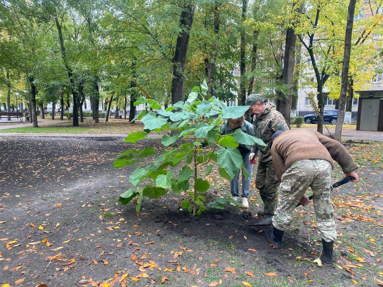 Осенняя кампания по высадке деревьев продолжилась в парке Юность пополнился 11 деревьями - багряником и павловнией.