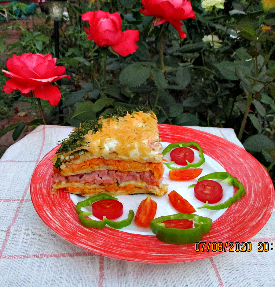 Теперь, когда все начинки готовы и блины остыли, можно собирать торт. Первый блин будет основой, затем добавьте половину начинки с морковью и сыром. Повторяйте процесс, чередуя между блинами занимательные начинки, пока не закончите все ингредиенты. В завершение посыпьте готовый торт тертым сыром и украсьте зеленью.
