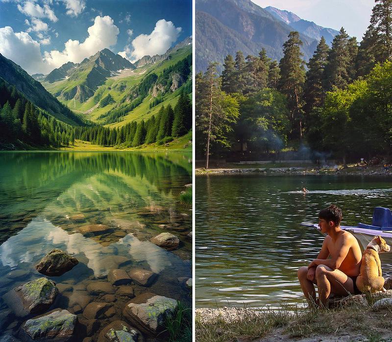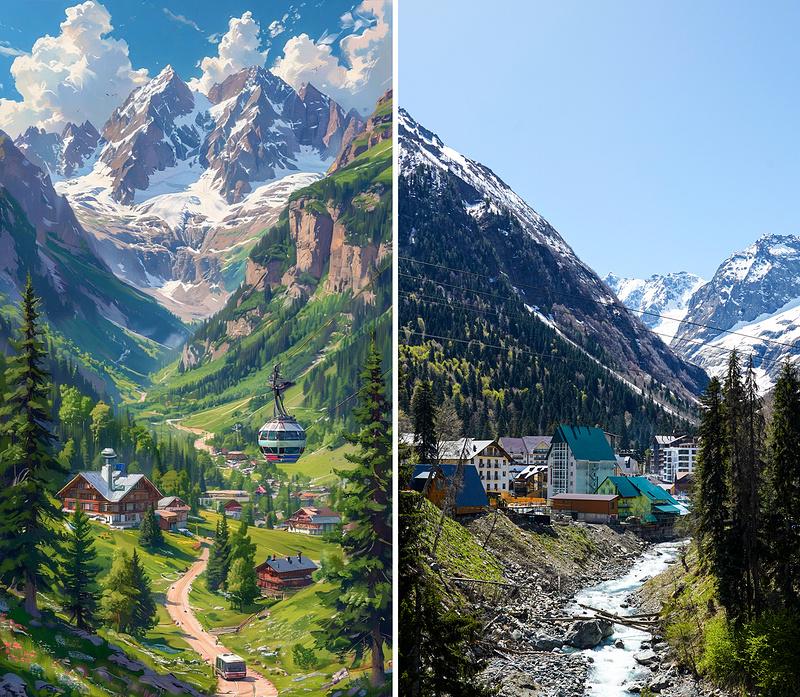 А с фотографиями все еще интереснее: слева на каждой мы разместили иллюстрацию от ИИ, а справа — настоящий пейзаж.