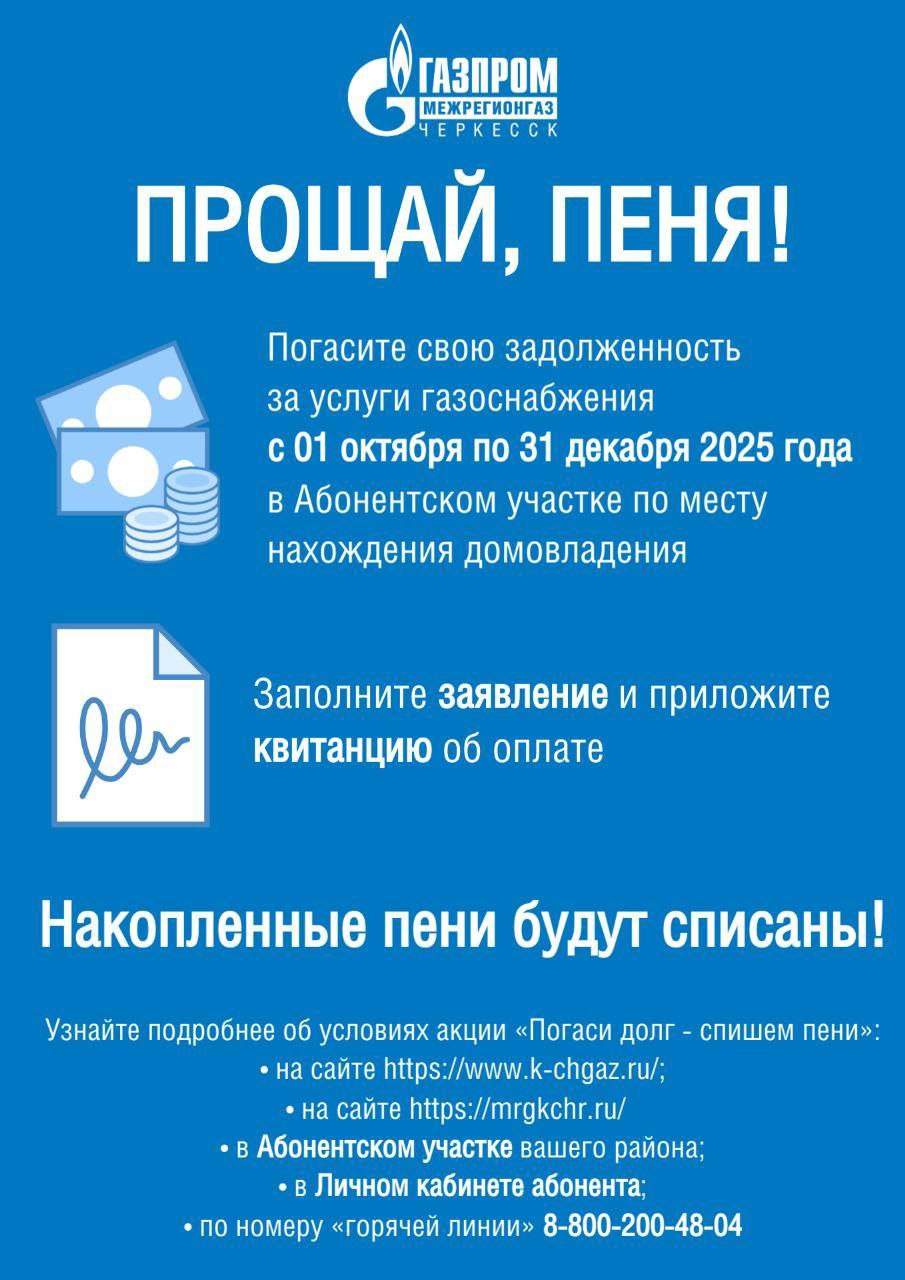 С 01 октября по 31 декабря 2025 года для жителей Карачаево-Черкесской Республики пройдет акция «Газпром межрегионгаз Черкесск» - «Погаси долг без уплаты пени».