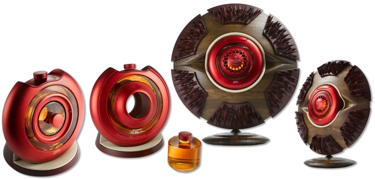 Футляр нового виски поразит ценителей: в нем предлагаются две бутылки, одна из которых содержит давно выдержанный напиток, а в другой — виски, произведенный в 2018 году с более высоким уровнем крепости — 54.6%. Внешний сосуд обрамлен элегантной дубовой скульптурой с двумя сотнями шипов, символизирующих юбилей винокурни и её приверженность бережному отношению к природе.