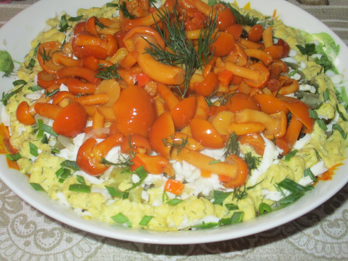 Приготовление начинается с того, что картофель натирается на крупной терке. Первый слой выкладывается на дно салатницы — затем на него размещается мелко нарезанный репчатый лук. Следующий шаг — натертая морковь, которая добавляет яркость и сладость. Далее слой заправки, затем укроп и малосольные огурцы. Наконец, натертые на терке белки вареных яиц укрывают все сверху. Завершает композицию изысканная подача маринованных опят, в окружении обильной порции заправки.