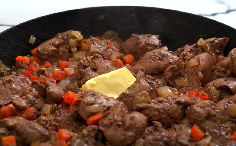 Тем временем нарежьте печень крупно и добавьте к овощам, не забыв про лавровый лист. Приправьте солью и перцем, затем тушите под крышкой на медленном огне. Обычно 8-10 минут достаточно, чтобы печень приготовилась, не потеряв сочности. После тушения добавьте немного масла, дайте настояться под крышкой пару минут для обогащения вкуса.