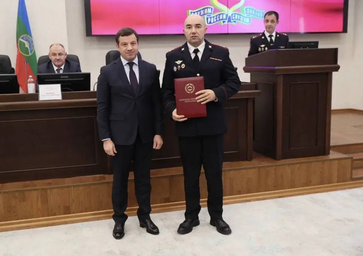 Руководитель региона поздравил сотрудников, ветеранов и руководство МВД по КЧР с праздником и поблагодарил их за профессионализм и самоотверженную службу на благо России. Он вручил государственные награды и почетные звания сотрудникам МВД по КЧР, отличившимся в службе, а также поздравил министра МВД по КЧР Владимира Нефедова с присвоением ему Президентом РФ Владимиром Путиным высокого звания генерал-майора полиции. Премьер-министр КЧР Мурат Аргунов также вручил сотрудникам МВД Почетные грамоты Правительства КЧР.