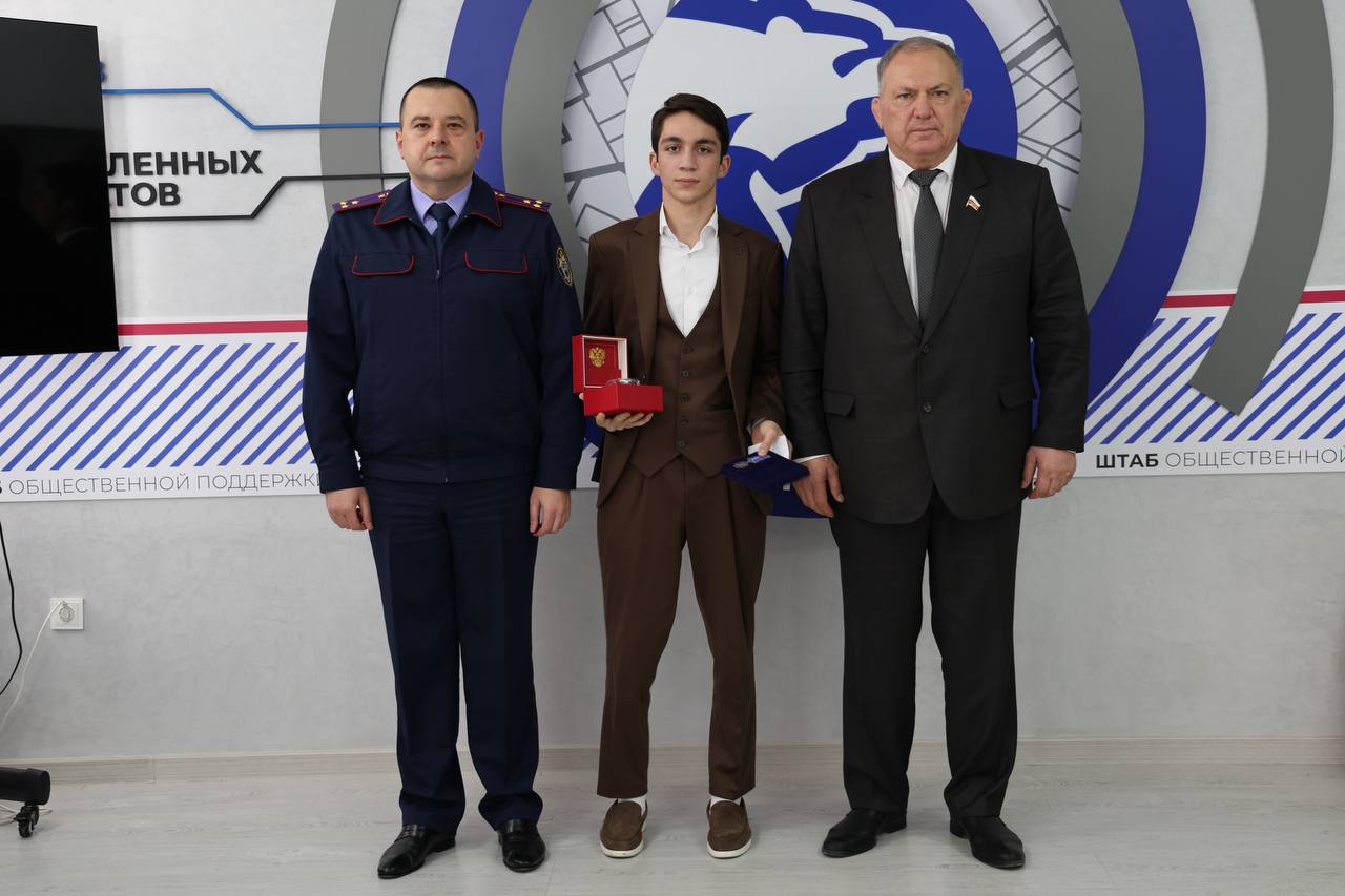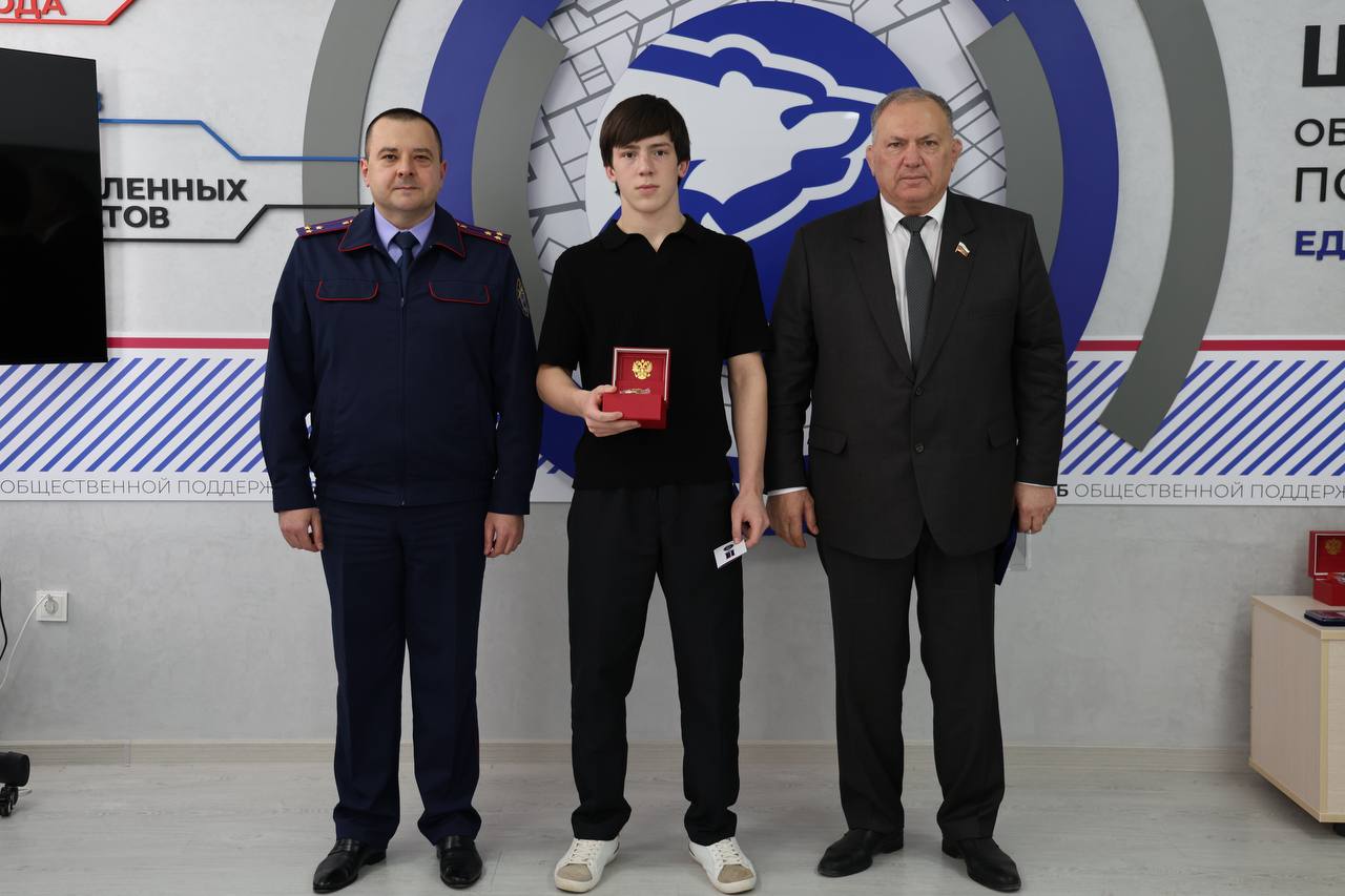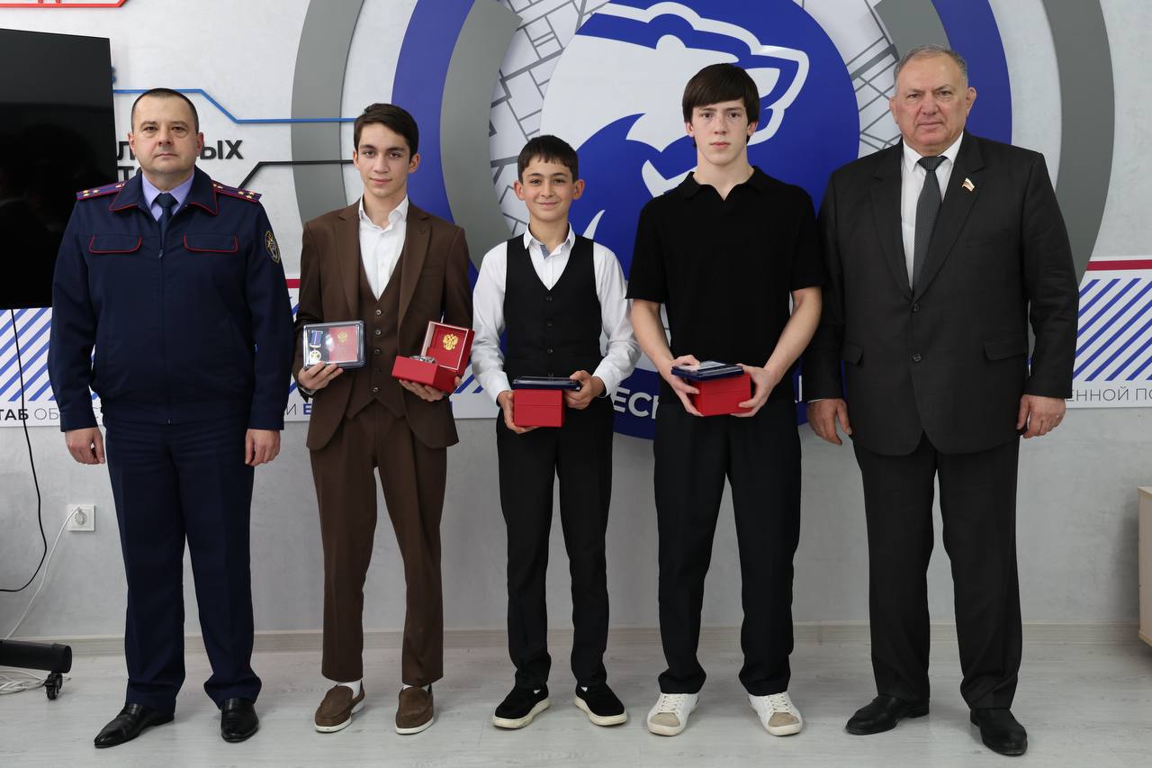 Заслуженные награды и ценные подарки ребятам, проявившим мужество в экстремальных ситуациях, вручили сенатор РФ Крым Казаноков и и. о. руководителя следственного управления Следственного комитета РФ по КЧР, полковник юстиции Владимир Хорольский. Церемония прошла на площадке Штаба общественной поддержки «Единой России».