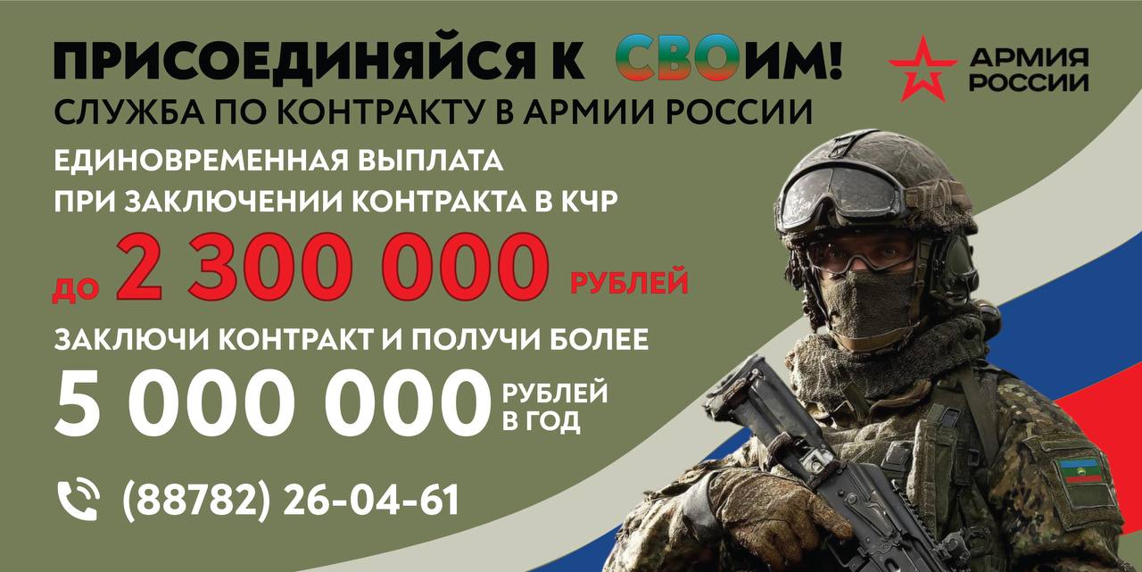Подробную информацию можно получить в военном комиссариате Карачаево-Черкесской Республики и пункте отбора на военную службу по контракту по телефону 8 8782 26 04 61, а также по ссылке https://kchr.ru/svo/