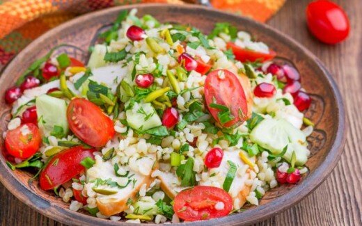 Параллельно булгур отваривается в подсоленной воде около 10-15 минут, после чего его нужно откинуть на дуршлаг и остудить. По истечении времени, помидоры нарезаются дольками, огурцы - кубиками, а лук - мелко. Все эти компоненты смешиваются с отварным булгуром и зеленью. Исключительное удовольствие проявляется, когда нарезанная куриная грудка добавляется в готовую массу, а для финального штриха блюдо посыпается фисташками и зернами граната.