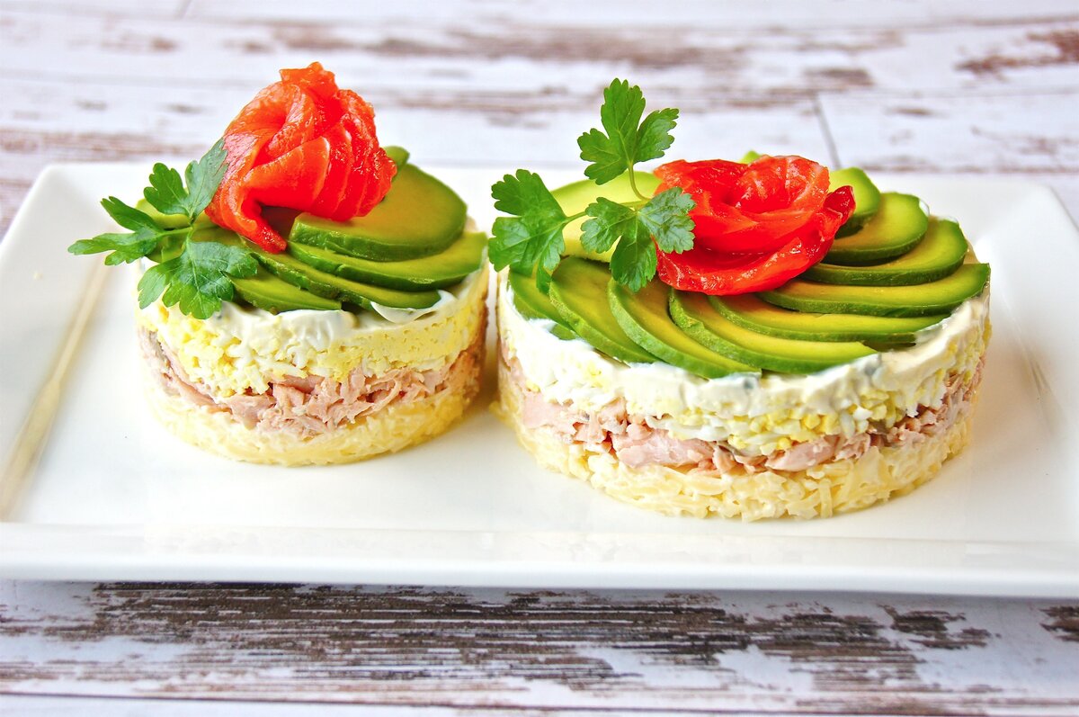 Этот салат станет настоящей изюминкой вечера! В его основе – свежая и аппетитная красная рыба, сочетание с нежнейшим авокадо и ароматными специями. Не стоит переживать, если вы предпочитаете избегать майонеза – лишь замените его на легкий йогурт, и получится не менее вкусное блюдо, хотя традиционная версия с майонезом, конечно, тоже стоит того, чтобы попробовать.