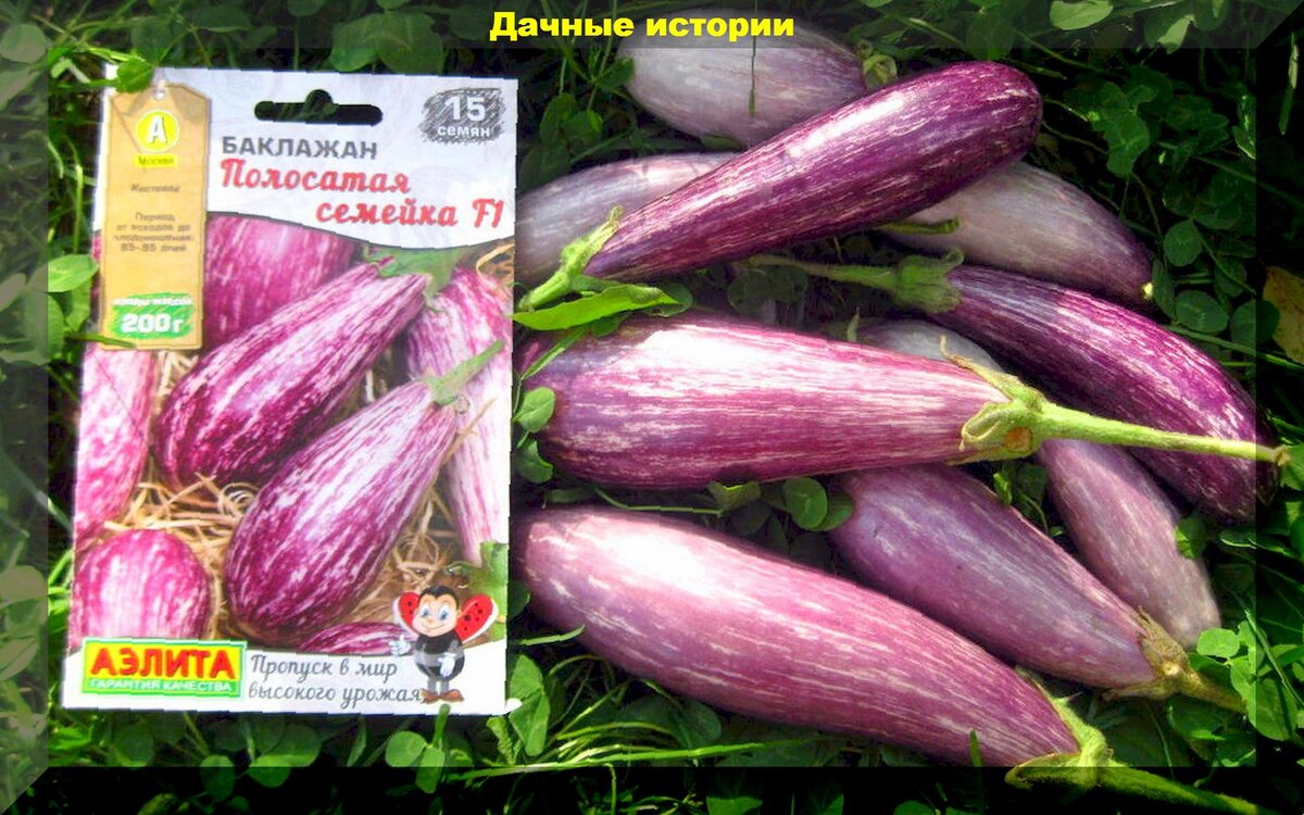 - Полосатые баклажаны: сорта, такие как "Полосатая семейка F1" и "Заморский Полосатик", поражают своим внешним видом. Их плоды украшены красивыми белыми штрихами на фиолетовом фоне и отличаются нежной, сладковатой мякотью.