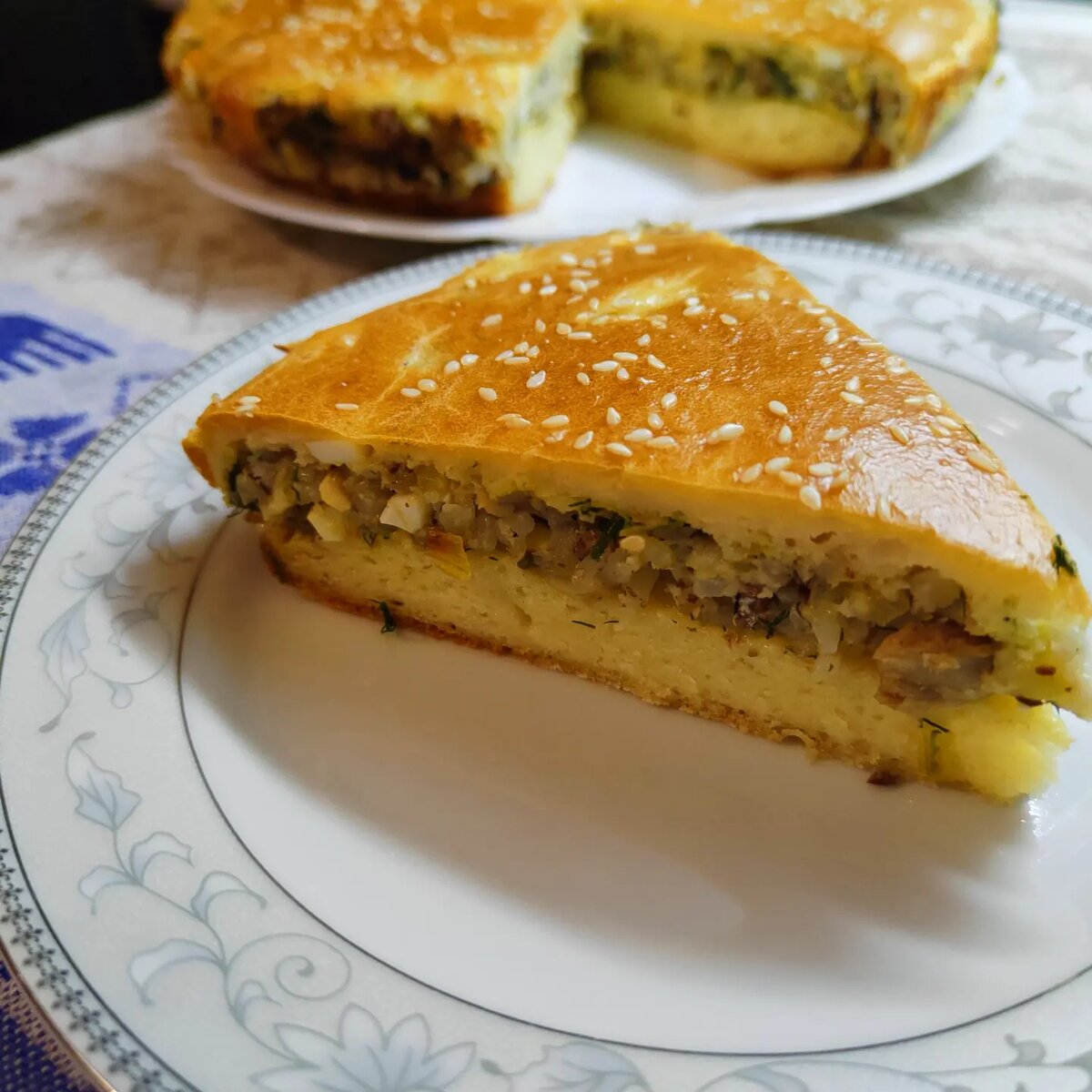 После того как нижний корж готов, на него равномерно выкладывается начинка, а сверху распределяется оставшаяся часть теста. Для визуального эффекта можно посыпать кунжутом. Возвращают пирог в духовку и допекают еще 20-25 минут до золотистой корочки.
