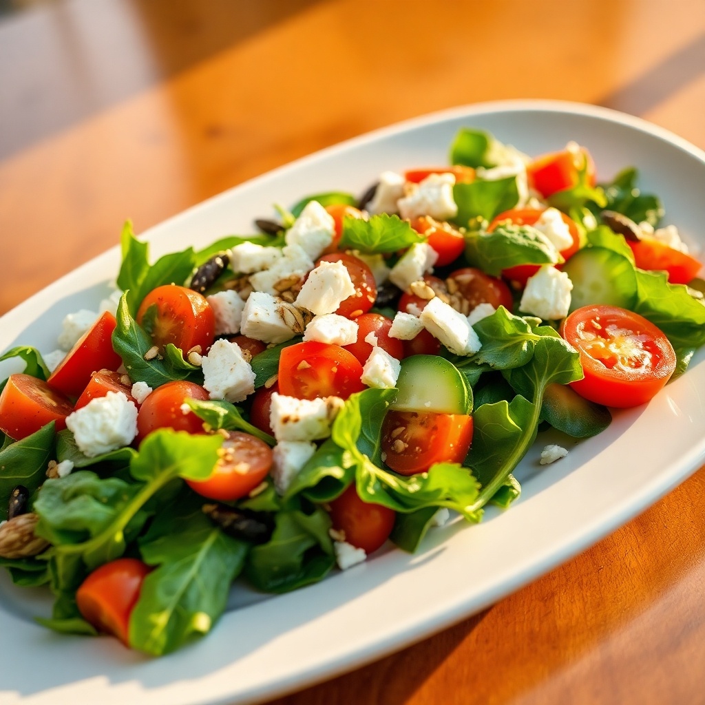 - Салат с тыквенными и подсолнечными семенами: Смешайте свежие овощи с обжаренными семечками, прыгайте к огурцам и черри.