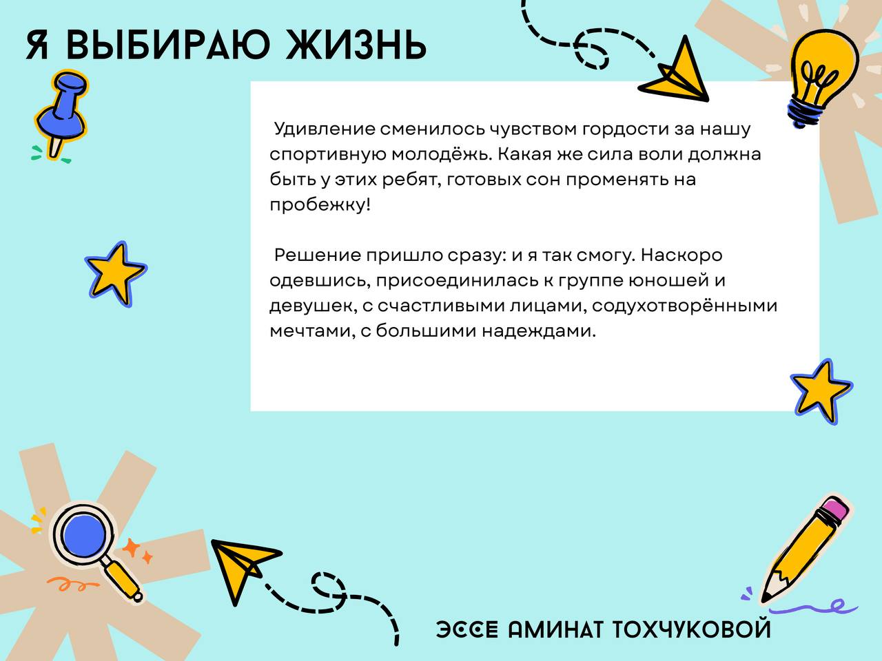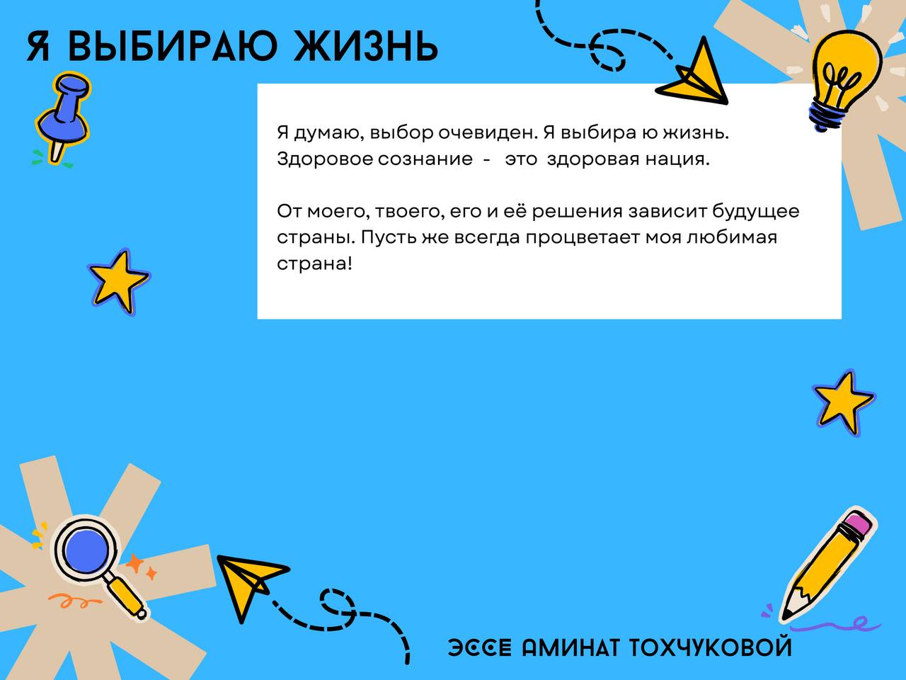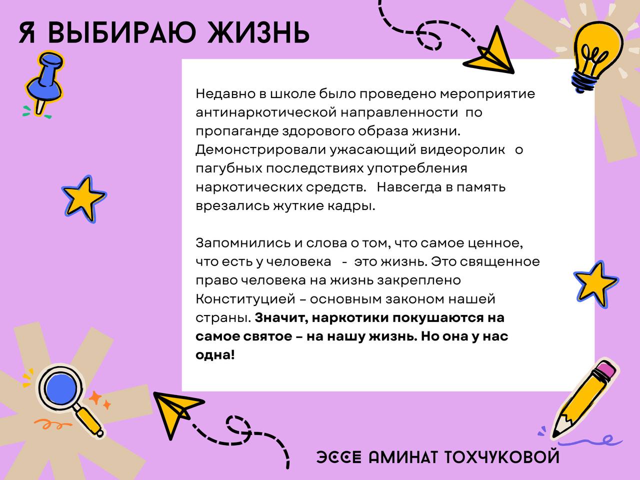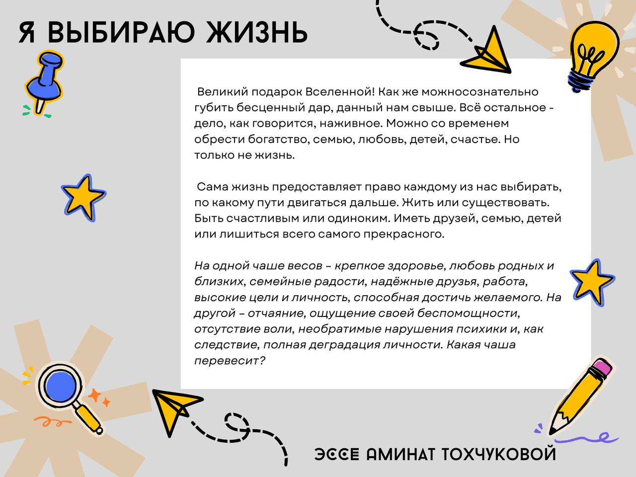 Это цитата из эссе ученицы гимназии №19 Аминат Тохчуковой - следующей участницы городского антинаркотического конкурса.