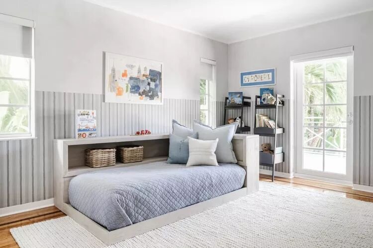 Яркие акценты. Например, васильковая мебель добавит нотку свежести и оригинальности. Этот запоминающийся цвет станет прекрасным дополнением к светло-серым стенам.