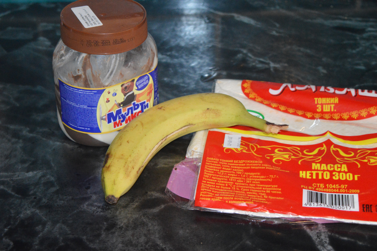 Процесс начинается с подготовки всех ингредиентов: положите банан, лаваш и банку с шоколадной пастой на кухонный стол. Если хотите, десерт можно украсить орехами, печеньем, цукатами или сахарной пудрой.
