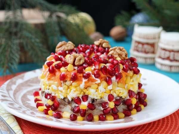 Первым слоем натираем морковь и укладываем её на дно, смазываем майонезом, а сверху посыпаем рублеными орехами, чтобы они были кусочками, а не крошкой. Далее тщательно сливаем жидкость с кукурузы и высыпаем её поверх орехов, добавляя снова немного майонеза.