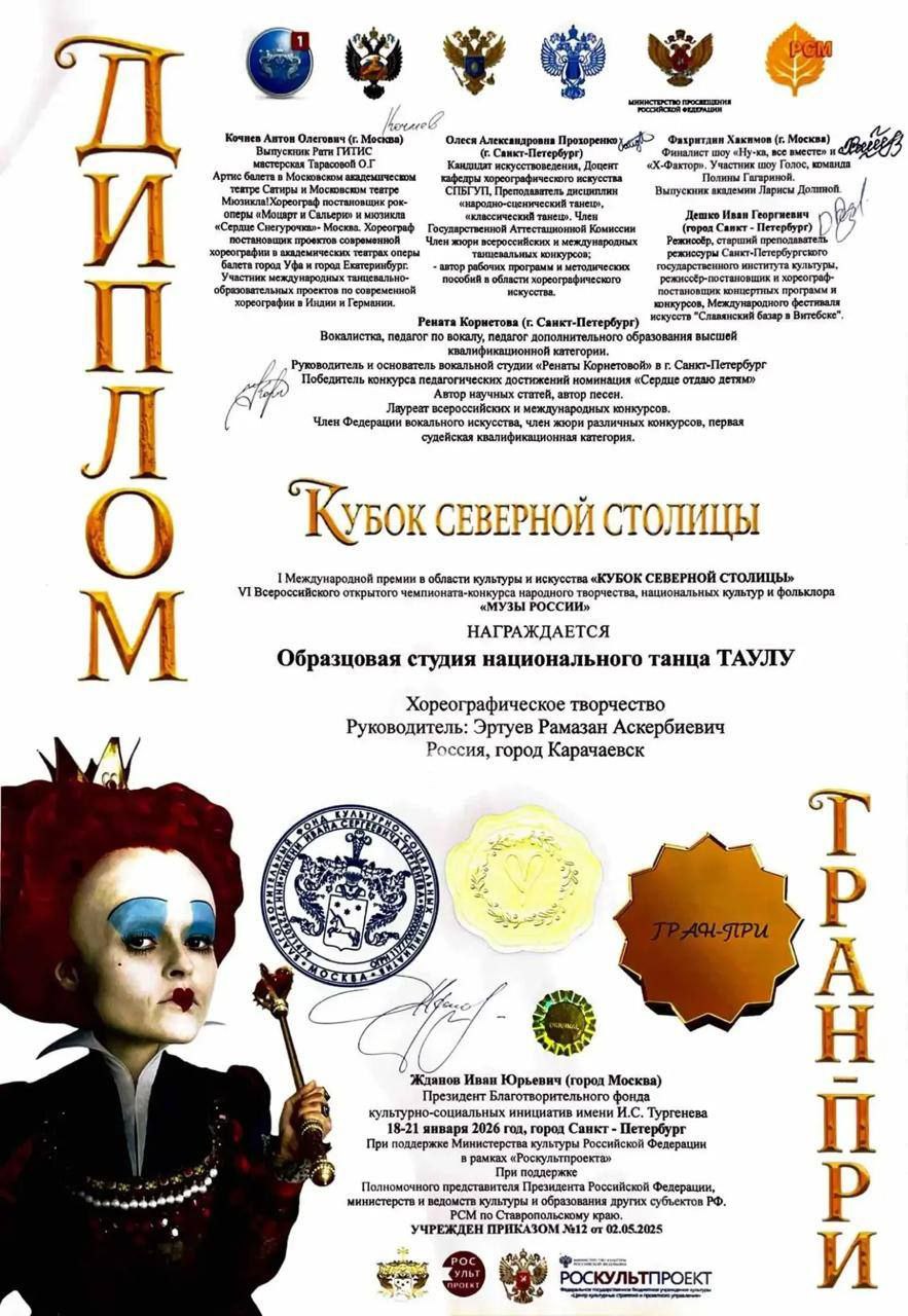 Образцовая студия танца «Таулу» из Карачаево-Черкесии получила Гран-при I Международной премии «Кубок Северной столицы» и VI Всероссийского чемпионата-конкурса «МУЗЫ РОССИИ», что прошли в Санкт-Петербурге.