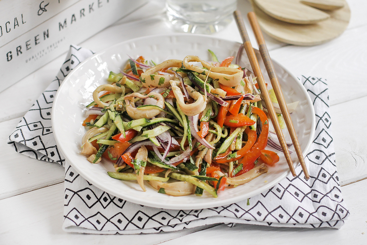 Здесь важен акцент на свежести: кальмары нарезаны соломкой и обжарены в горячей сковороде, чтобы сохранить сочность и легкую хрустящесть. Вместе с перцем и чесноком они успевают раскрыть характер за считанные минуты.