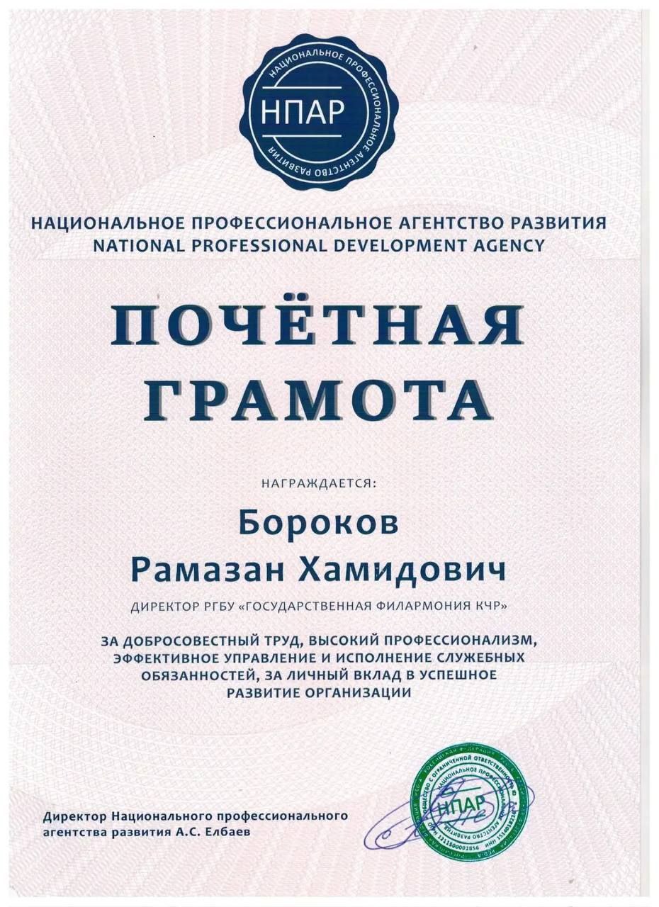 Кроме того, почётную грамоту за добросовестный труд, эффективное руководство и личный вклад в развитие учреждения вручили директору филармонии Рамазану Хамидовичу Борокову.