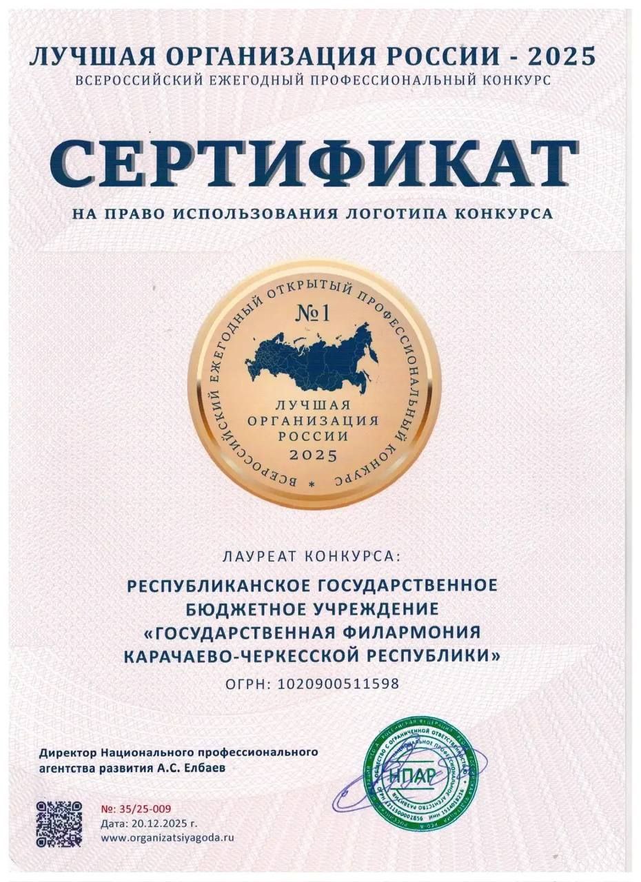 Государственная филармония КЧР стала лауреатом Всероссийского профессионального конкурса Лучшая организация России 2025.