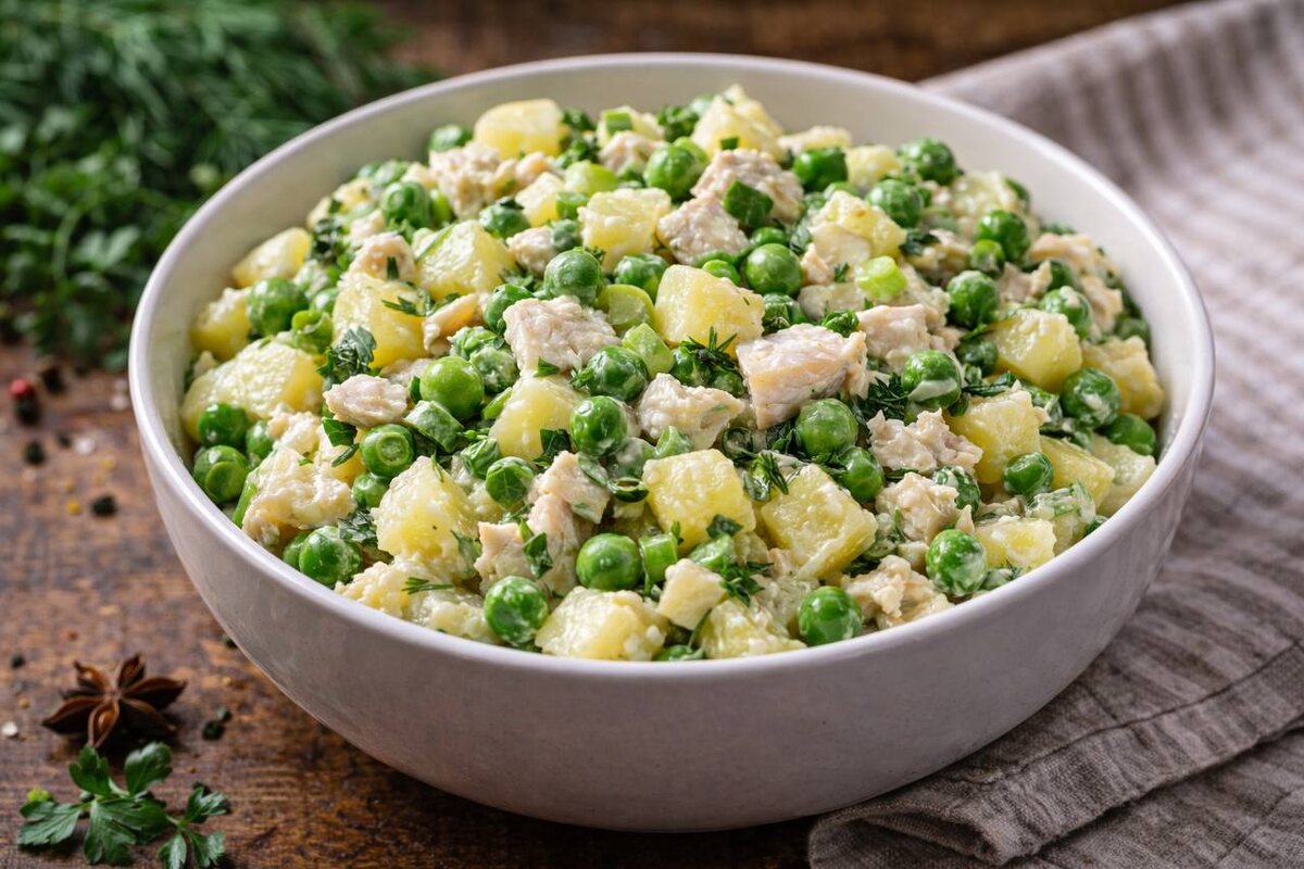 Причина популярности подобных салатов в их простоте и гармонии. Картофель придаёт блюду насыщенность, рыба дарит вкус, горошек добавляет нежности, а зелень привносит свежесть. Все компоненты прекрасно сочетаются и не создают конфликтов.