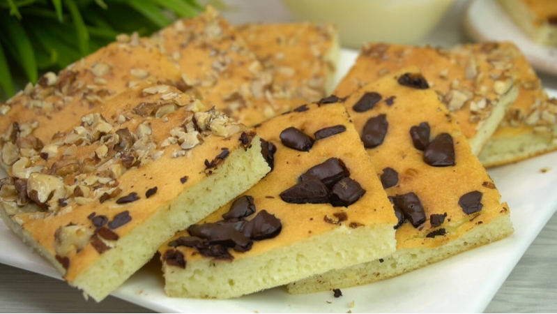 3. Противень застелить пергаментом или специальной силиконовой ковриком без масла. Вылить тесто на противень. Дополнив половину теста грецкими орехами, а другую — шоколадом, можно также использовать свежие фрукты или ягоды.