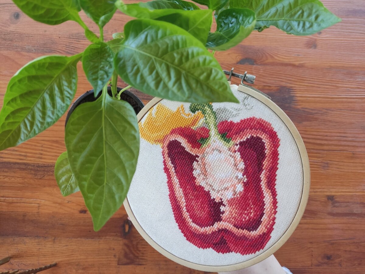 В вышивке выбрана "перцовая" тема, и на практике она точно оправдывает себя. Растение стало постоянным жителем контейнерного сада.