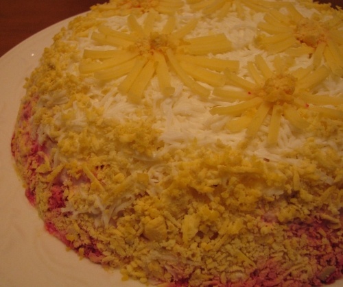 После укладки всех слоев, салат рекомендуется тщательно смазать майонезом и посыпать натертым вареным яйцом, придавая ему финальный штрих. Можно украсить его цветами из сыра для придания праздничного вида.