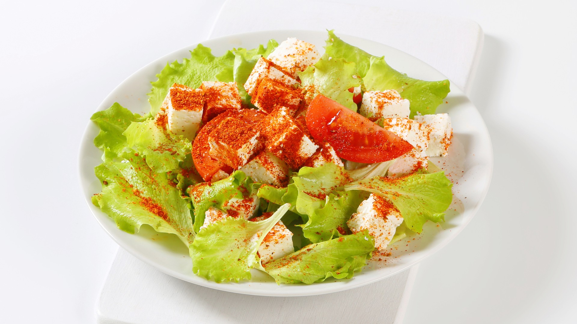 Томаты нарезаются крупными ломтиками, а колбасный сыр кубиками. Зелень измельчается. Она может быть любая по вкусу: петрушка, укроп, базилик, кинза и т. д.