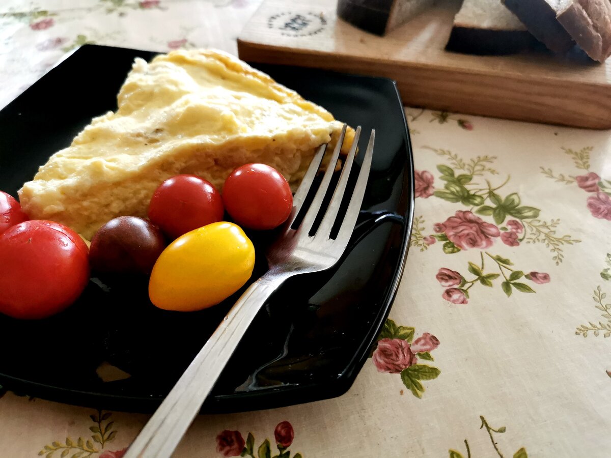 Когда омлет будет покрыт крышкой и поставлен на минимальный огонь, он начнет подниматься, превращаясь в легкое воздушное блюдо. В это время можно успеть накрыть на стол и подготовить свежие овощи, выращенные в своем саду. По готовности омлет принимают красивую форму, а подавать его лучше всего с огурцами и помидорами.