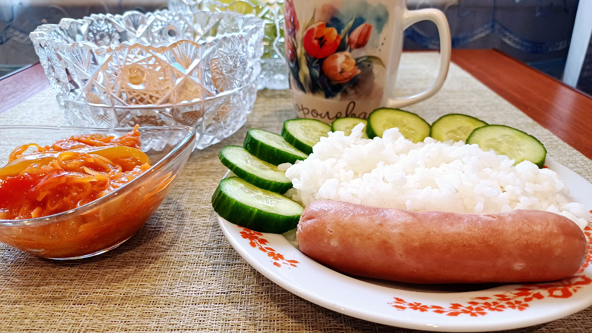 Сегодня на обед подготовлен удивительно простой набор: рассыпчатый белый рис, сосиска и свежий хрустящий огурец. Это сочетание не требует много времени на приготовление и отлично подходит для быстрого перекуса.