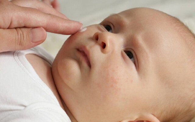 Красные или розовые точки на щеке и подбородке могут быть вызваны гормонами, которые передала мать. Эти прыщи не требуют лечения; достаточно простого ухода — регулярно мыть лицо малыша теплой водой.