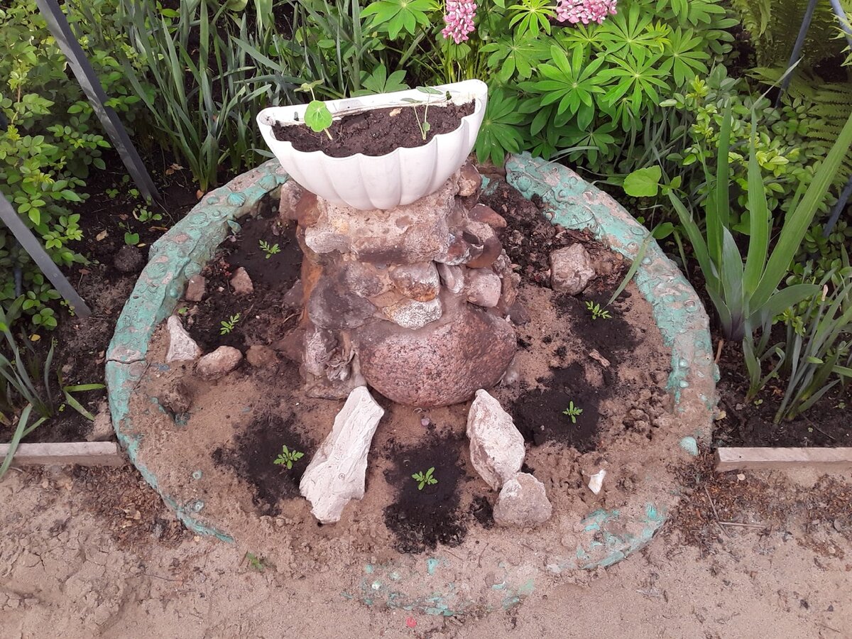 На дачном участке, оставшемся в наследство, некогда простоявший фонтан стал интересным объектом творчества и садоводства. Шарик среди зелени, он будто придаёт участку атмосферу древности и загадки. Прежние владельцы явно оставили его не просто так, однако сложно было представить, как с ним работать, не обладая смелыми дизайнерскими идеями.