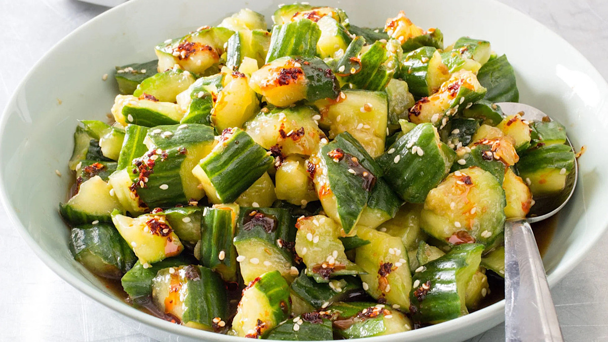 Когда огурцы будут немного смяты, разорвите их на небольшие кусочки руками. Это придаст салату еще больше текстуры и сделать его более интересным.