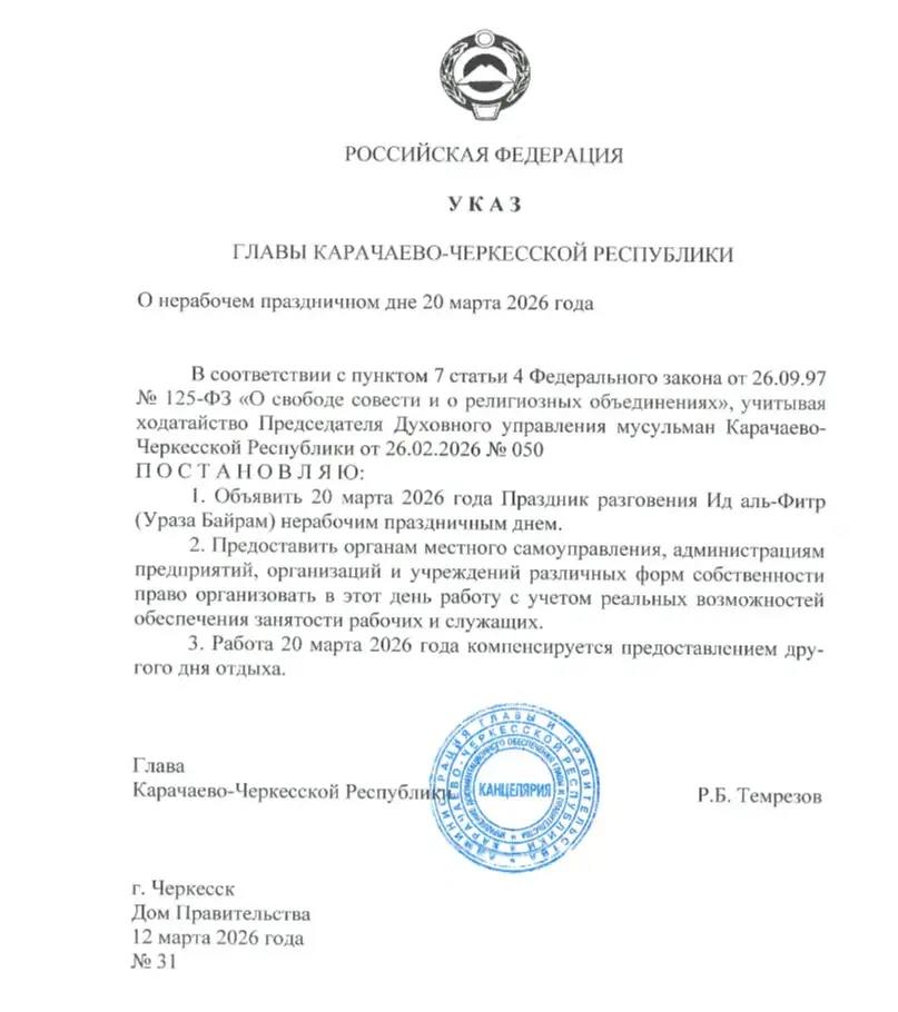 Глава Карачаево-Черкесии Рашид Темрезов подписал Указ, согласно которому 20 марта 2026 года - праздник разговения - Ид аль-Фитр (Ураза Байрам) в республике объявлен нерабочим днем.