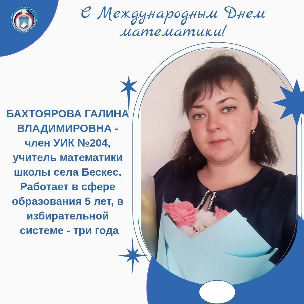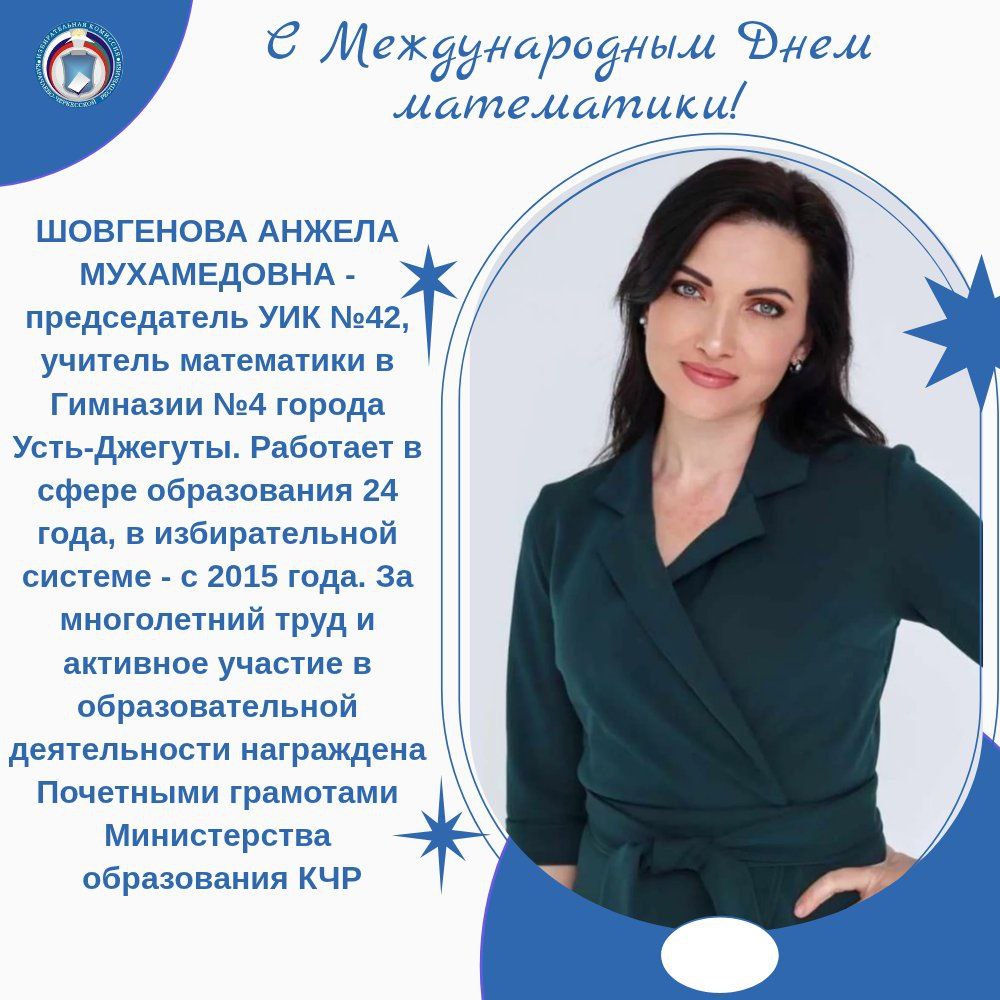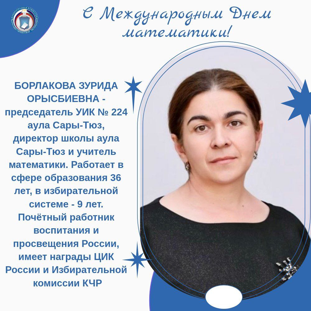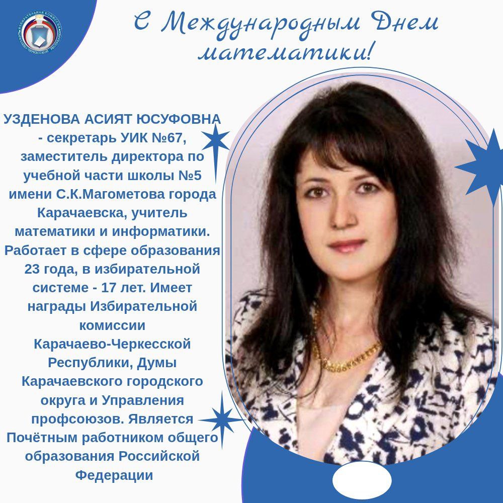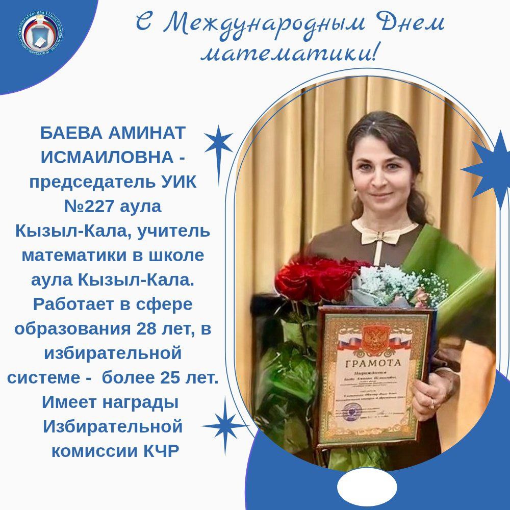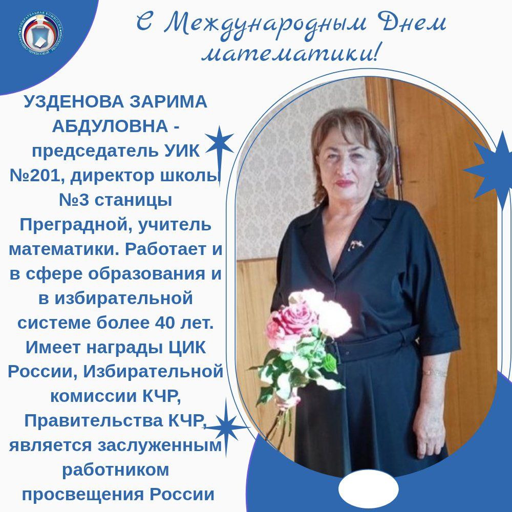 В этот день, особые слова благодарности выражаем педагогам, усилиями которых их ученики достигают высоких результатов. В избирательных комиссиях Карачаево-Черкесии много работников сферы образования - в том числе и учителей математики. Все они имеют многочисленные награды за заслуги, высокий профессионализм и большой вклад в развитие и воспитание школьников, также они поощрены грамотами ЦИК России и Избирательной комиссии КЧР. Сегодня мы рассказываем лишь о некоторых из них.