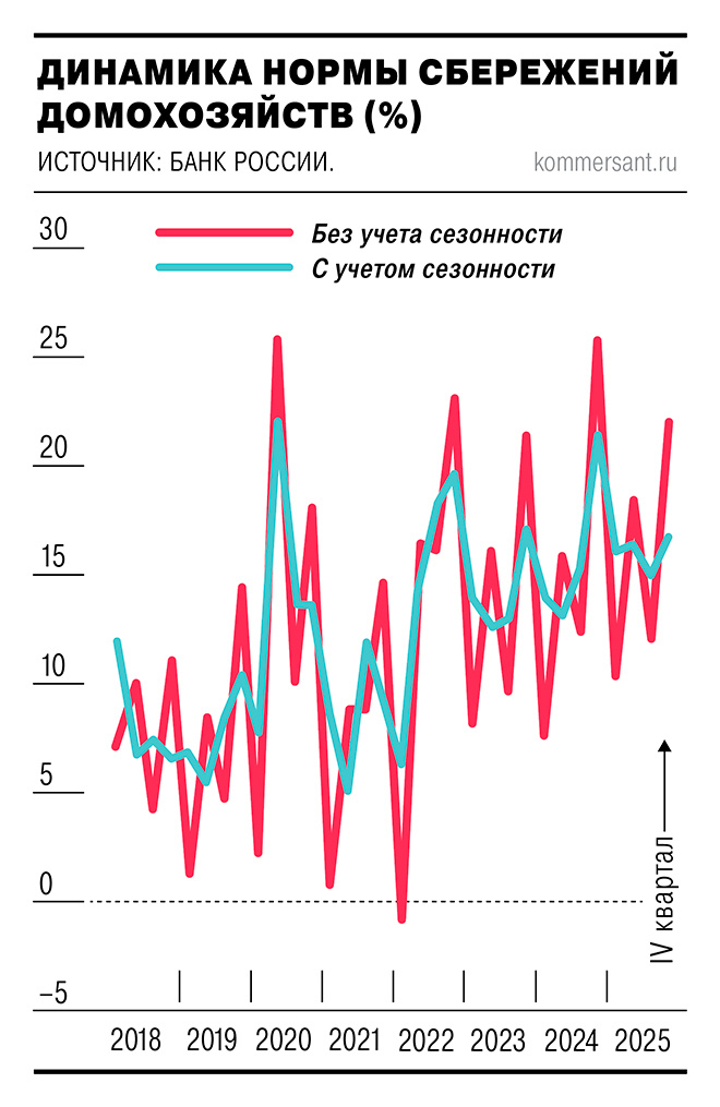 Мониторинг экономики домохозяйств: Банк России впервые обнародовал квартальную оценку нормы сбережений, отражающую долю доходов, не направляемую на текущее потребление. Этот показатель помогает аналитикам оценить не только текущий спрос, но и его потенциальную динамику. По последним данным регулятора, в четвертом квартале 2025 года норма сбережений составила 16% с учетом сезонных колебаний, в то время как без учета этих факторов показатель достиг 22,9%.