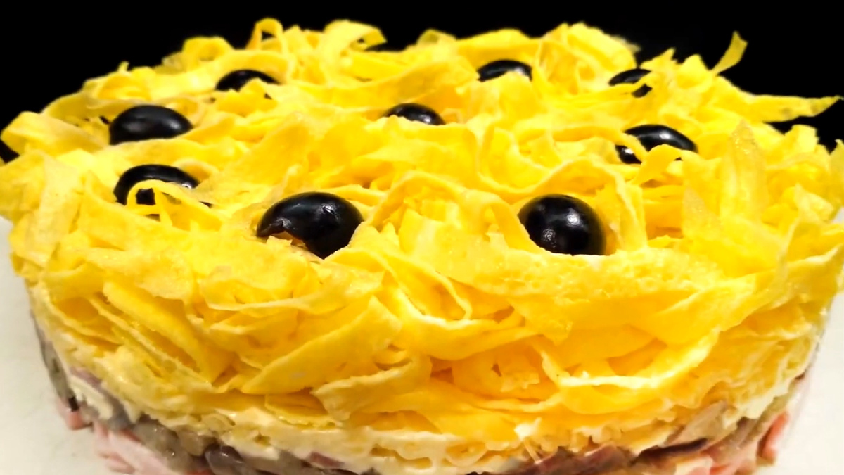 Завершение образа — аккуратная подача и небольшие акценты: маслины на блюде добавляют цвет и нотку пикантности, йогурт и майонез создают нежную связку, которая держит все ингредиенты вместе, не утяжеляя блюдо. Получается салат, который легко повторить и который смотрится достойно за праздничным столом, не требуя сложной готовки.
