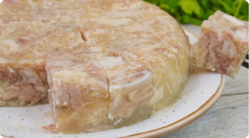 - Желатин: Не стоит добавлять желатин в пакете. Правильные части мяса, такие как голяшки или уши, уже содержат необходимое количество коллагена для застывания.