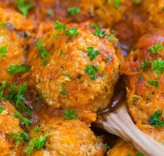 Подготовка капусты: Нарезать капусту небольшими квадратиками и залить их кипятком в миске на 7 минут.Обработка ингредиентов: Слить воду с капусты, отжать её и мелко нарезать лук. Отварить рис до готовности.Смешивание: В глубокой миске объединить фарш, капусту, отварной рис и нарезанный лук, добавить соль и перец по вкусу. Тщательно перемешать.Формирование тефтелек: Из полученной массы сформировать котлетки и обвалять их в панировочных сухарях.Обжарка: На разогретой сковороде с небольшим количеством масла обжаривать тефтели до золотистой корочки с обеих сторон. Снять с огня.Приготовление соуса: В отдельной миске смешать томатную пасту и натертую на мелкой терке морковь.Запекание: В форму для запекания выложить тефтели, залить их приготовленным соусом и поставить в предразогретую духовку на 180°C на 45 минут.Подача: После готовности вынуть из духовки, посыпать зеленью и подавать к столу. Традиционно сервировать со сметаной.Приятного аппетита!