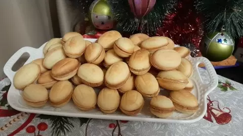 Пока противни с орешками выпекаются, сгущенное молоко можно сварить в воде, чтобы получить ту самую желанную карамельную консистенцию. После готовности, орешки следует аккуратно начинить вареной сгущенкой, склеивая половинки между собой.