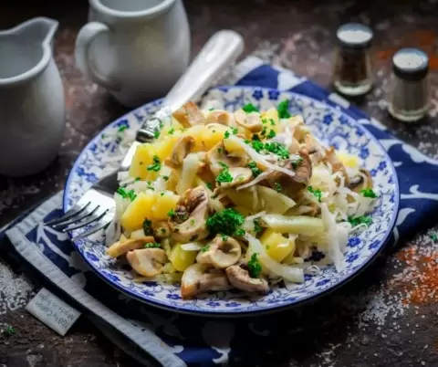 Лук-порей и сельдерей тщательно промывают и нарезают. Грибы нарезаются ломтиками, а чеснок рубится. Обжарьте все продукты на растительном масле до готовности, добавив специи по вкусу. В конце можно украсить зеленью – просто, быстро и очень вкусно!