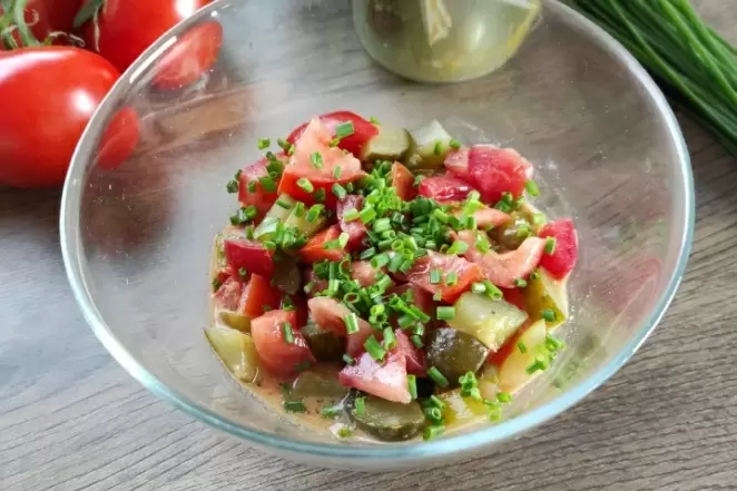 - Томаты с огурцами и луком — простое, но яркое сочетание, которое идеальное для весеннего стола. Помидоры и огурцы дополняются овощным ароматом, а разнообразие зелени позволяет менять вкус блюда каждый раз.