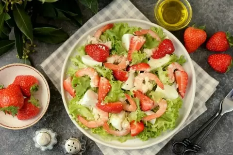 Весна — время обновлений и ярких вкусов, что отлично отражается в этом необычном салате с креветками и клубникой. Сложив в единую композицию морепродукты, сочные ягоды и хрустящую зелень, можно создать блюдо, которое покорит даже самых искушенных гурманов.